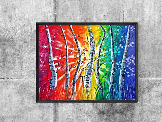 Rainbow Light Acrylic Painting On Stretched Canvas Colorful Birch Tree Wall Decor Handpainted Whimsical Rainbow Reflected Birch Tree Art