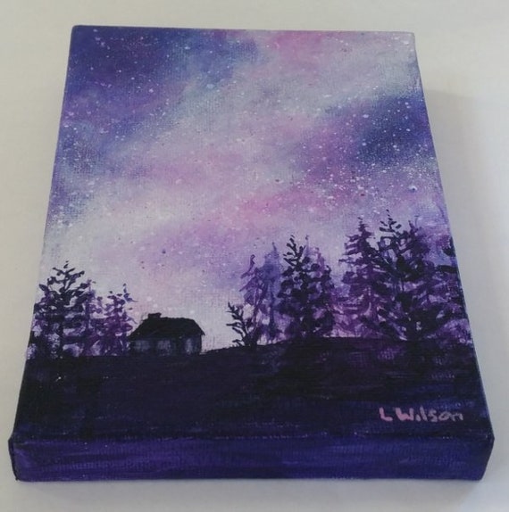 Acrylic Painting Night Time Landscape Night And Stars Purple Painting Pine Tree Forest With Cottage Glowing Starry Sky Art Original
