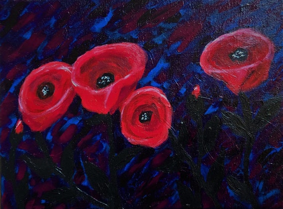 Night Time Red Poppies Acrylic Painting