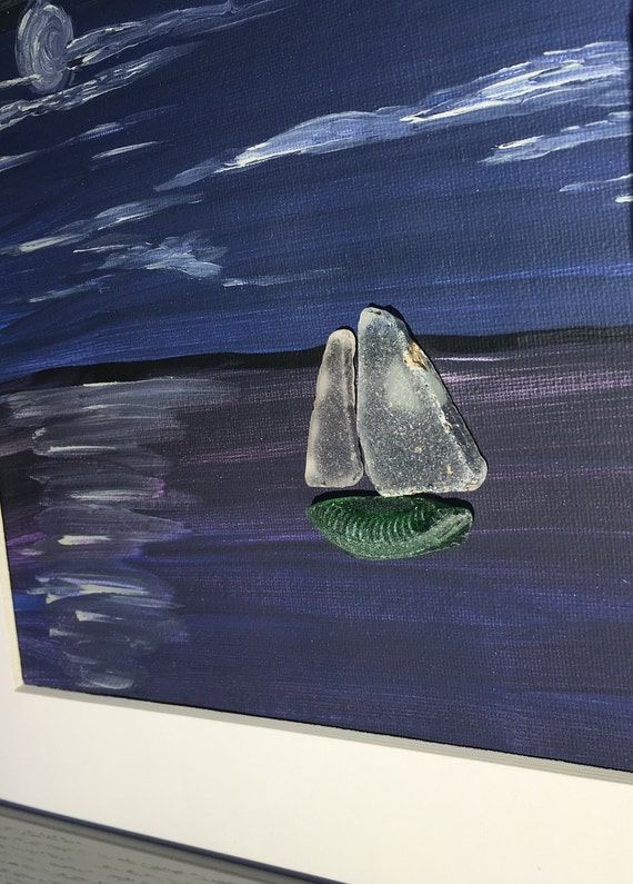 Framed Acrylic Night Time Ocean Painting 8x10 With Natural Sea Glass Hand Chosen From Ri And Md Beaches