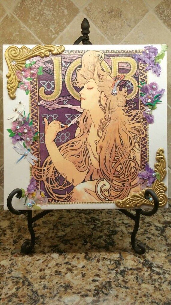 Antique Art Nouveau Style Alphonse Mucha Job Cigarette Ad Handmade Mixed Media Ceramic Artist Tile Painting Art