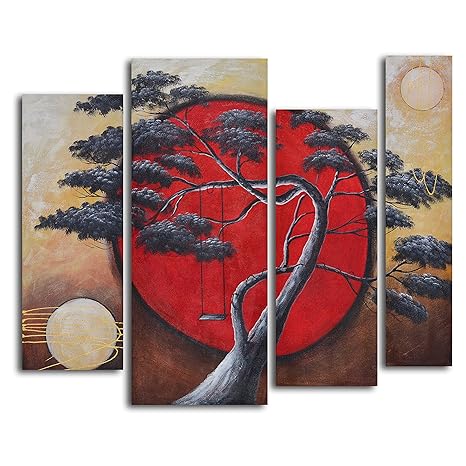 Tjie Art Hand Painted Mordern Oil Paintings Crimson Sun Midnight Moon 4 Piece Oil Painted Wall Art Set Asian Inspired Modern Painting In Nature