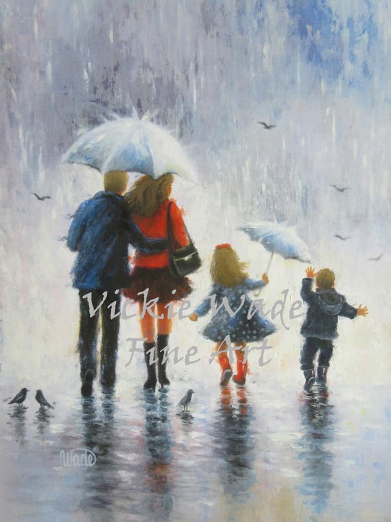 Rain Family Art Print Big Sister Little Brother Girl And Boy Mom And Dad Mother Father Walking Rain Umbrella Painting Vickie Wade