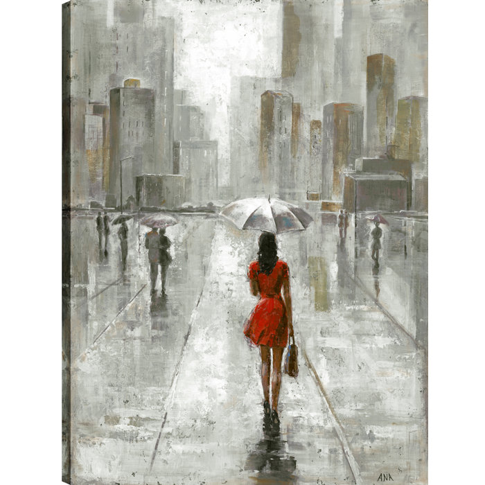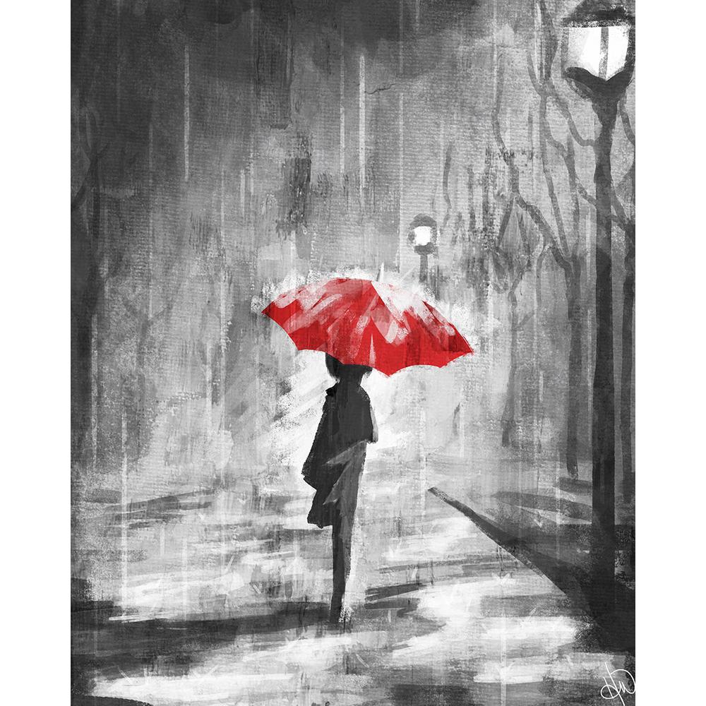 Girl Holding Red Umbrella Walks Through Rain Abstract Painting